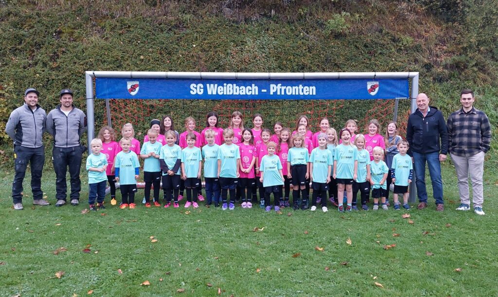 Erst in diesem Frühjahr wurde bei der Sportgemeinschaft Weißbach eine Fußballmannschaft für Mädchen im Alter von 6 bis 10 Jahre gegründet. Auf Initiative mehrerer ehemaliger Spielerinnen der Frauenmannschaft sind die Mädchen seitdem mit großer Begeisterung auf dem Fußballplatz im Training aktiv. Ebenso die jüngsten Fußballer von 3 bis 6 Jahre des mit rund 1.200 Mitglieder zählenden Hobbysportverein aus Pfronten. Beide Teams freuen sich nun über neue Trikots mit denen Sie bei Spielen, Turnieren und die Mädchenmannschaft künftig auch im Ligabetrieb auf Torejagd gehen können. Diese Anschaffung war nur mit großzügigen Partnern möglich. Erwähnt werden darf in diesem Zusammenhang die Zimmerei & Holzbau Petermann-Lotter, Erhart Werkzeug und Gerätebau GmbH, Sport Kolb, Haff & Schneider GmbH & Co OHG sowie Florian Hammer Zerspanungstechnik.
